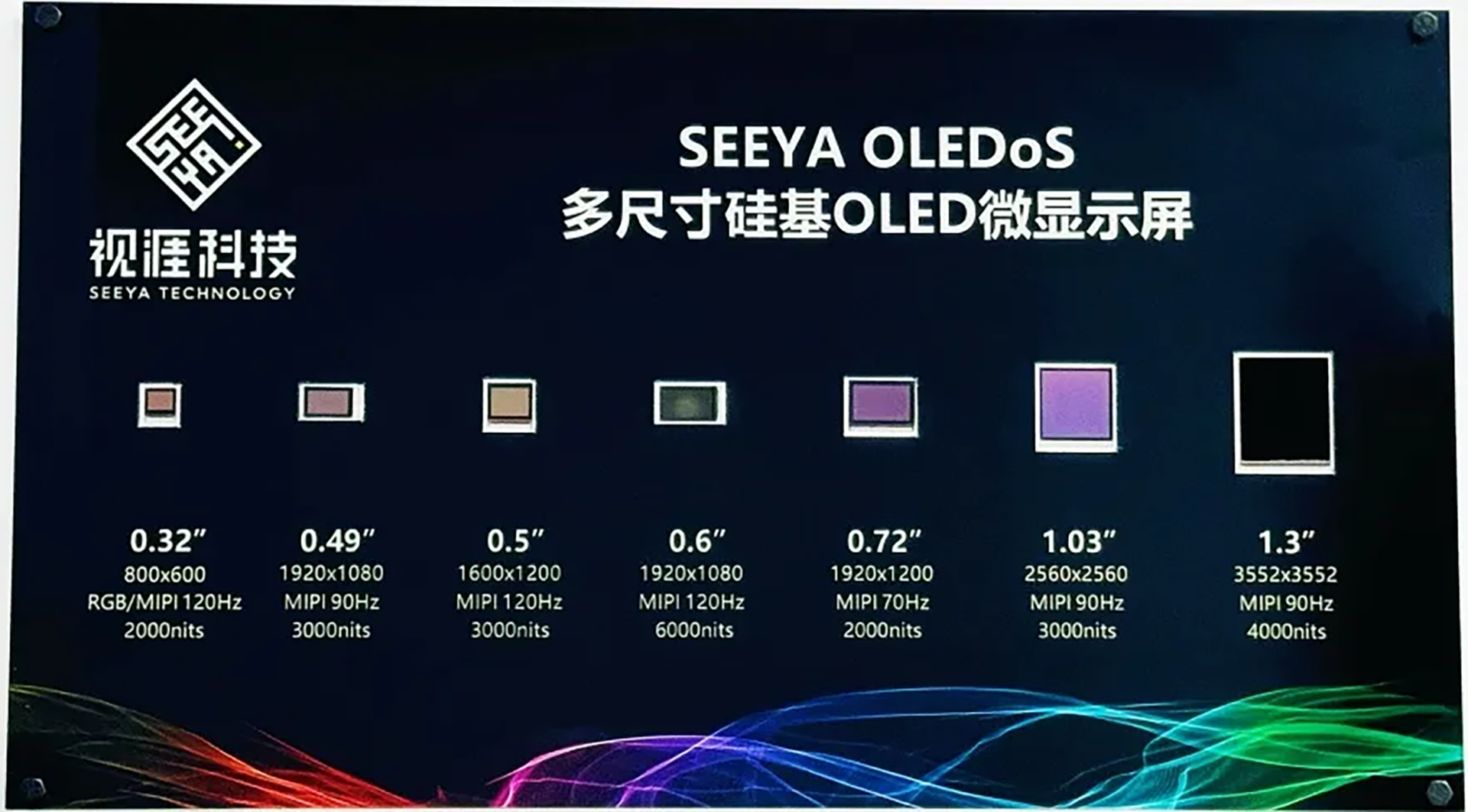 此次展出的屏幕涵盖了从0.32至1.3英寸的多种规格、多种参数,全面适配VR、AR、MR、FPV、热成像等多种不同应用领域,具备高对比度、广色域与低功耗等优势。
