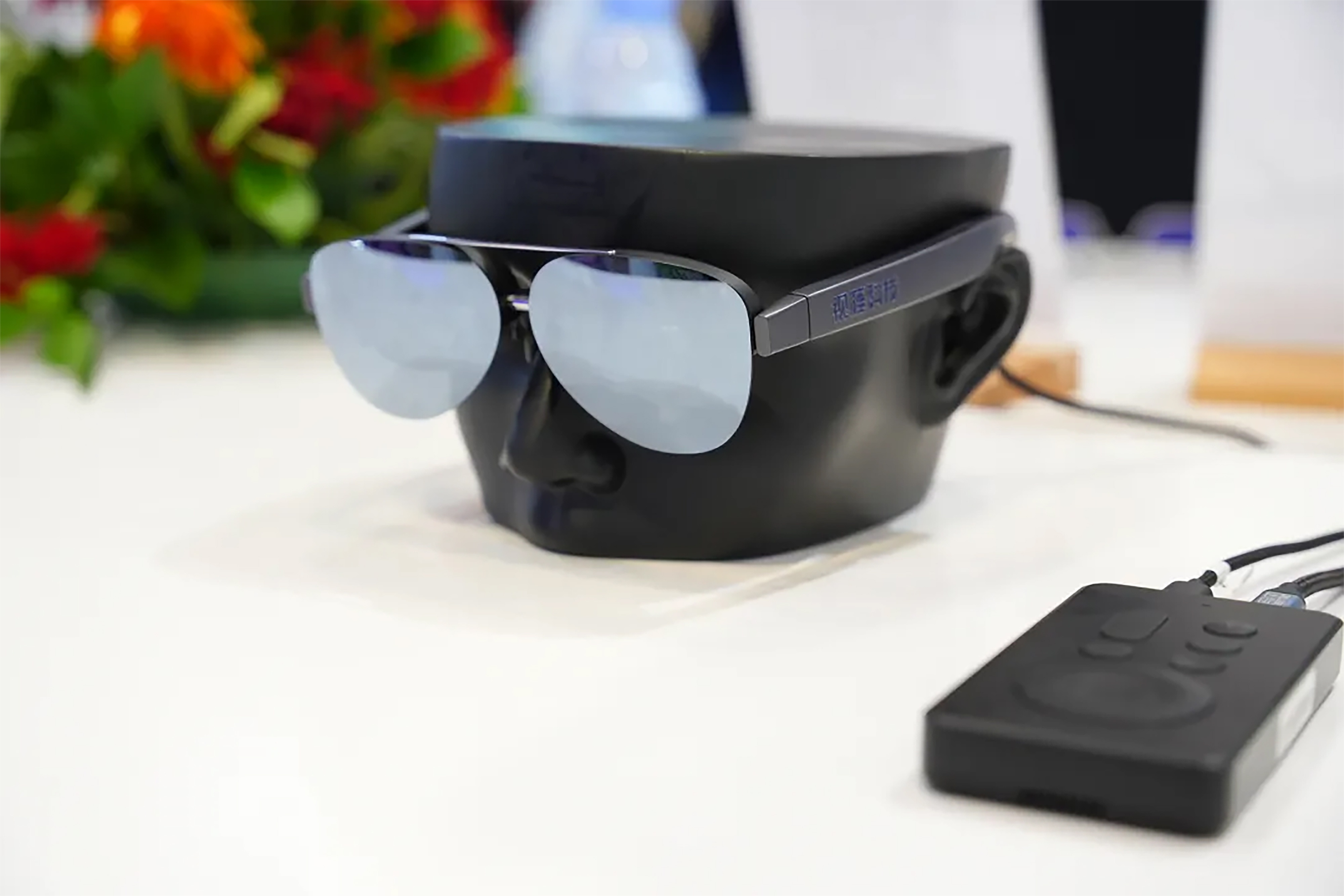在整机参考方案展台引得观众排队试戴的是全新飞行墨镜造型设计的Pglass2。它搭载双0.6英寸全彩视涯Micro OLED屏,在第一代基础上进行了视觉体验的升级,提供1920×1080高清细腻的视觉体验,最大入眼亮度可达800尼特,支持60Hz、90Hz、120Hz三档动态刷新率调节。
